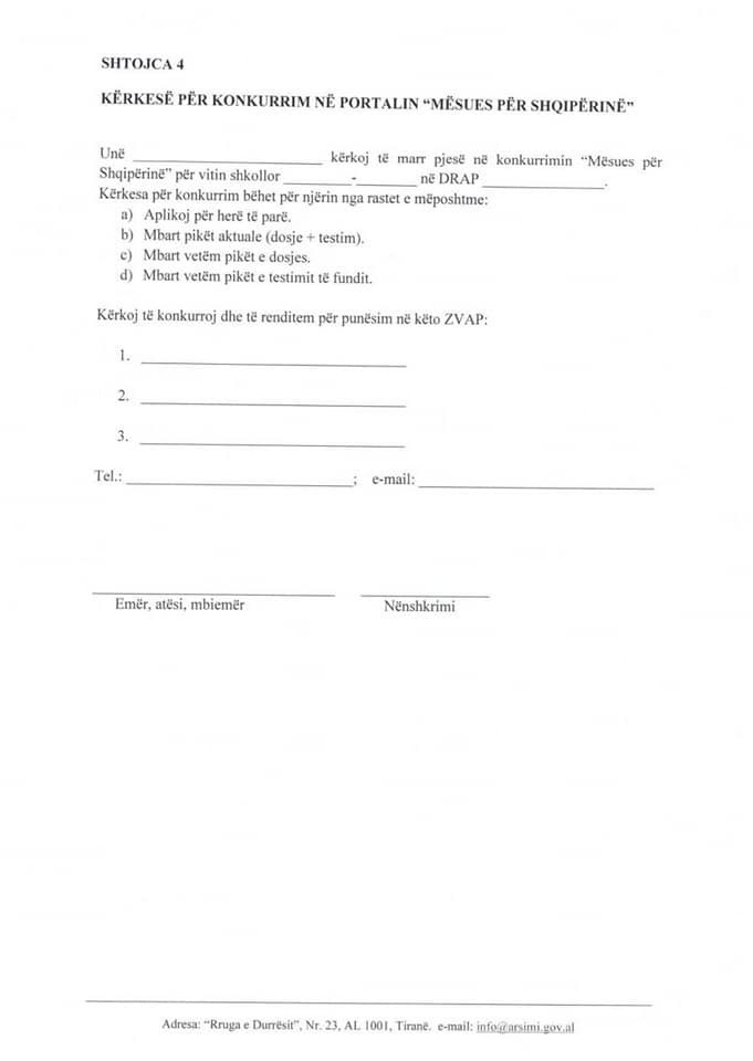 Më poshtë do të njiheni me procedurat e pranimit e të emërimit të mësuesit në një vend të lirë pune në institucionet arsimore publike të arsimit parauniversitar dhe për administrimin e portalit "Mësues për Shqipërinë".