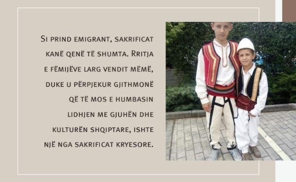 Si prind emigrant, sakrificat kanë qenë të shumta. Rritja e fëmijëve larg vendit mëmë, duke u përpjekur gjithmonë që të mos e humbasin lidhjen me gjuhën dhe kulturën shqiptare, ishte një nga sakrificat kryesore.