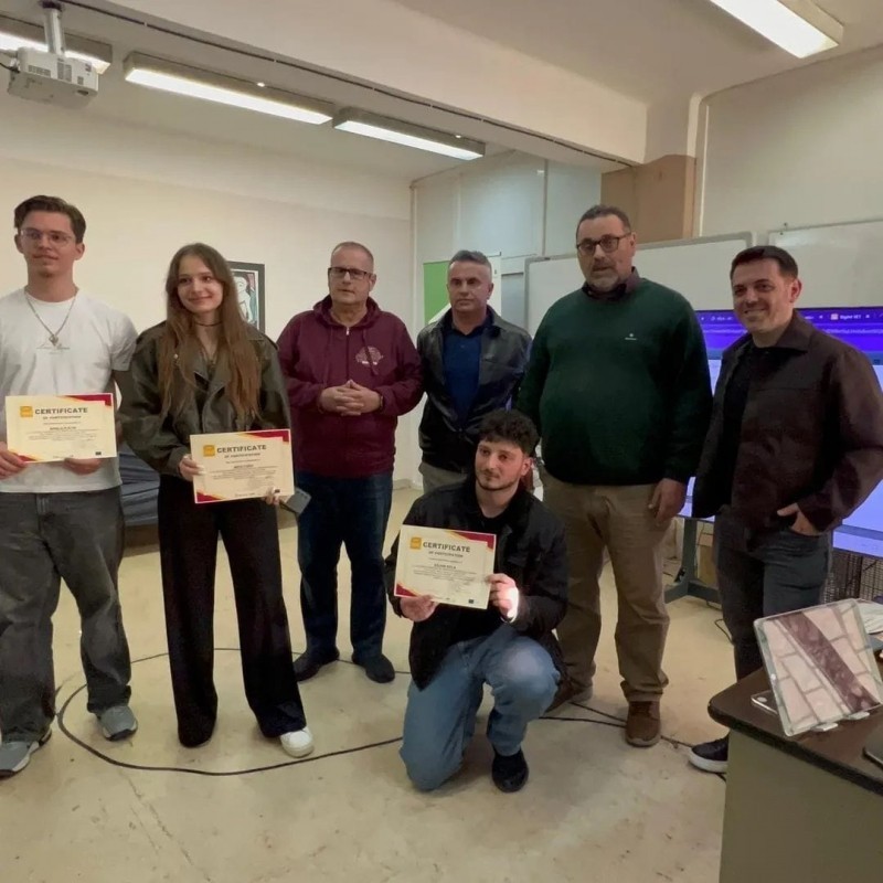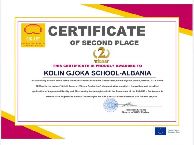 Shkolla e Mesme Profesionale "Kolin Gjoka" Lezhë shkëlqen në Athinë, duke fituar vendin e parë me projektin AR “Twin Tower” dhe të dytin me “Mrizi i Zanave Agroturizëm” në BIG ART International Bootcamp. Nxënësit dhe mësuesit u dalluan për kreativitet dhe përdorim inovativ të teknologjive 3D dhe AR.