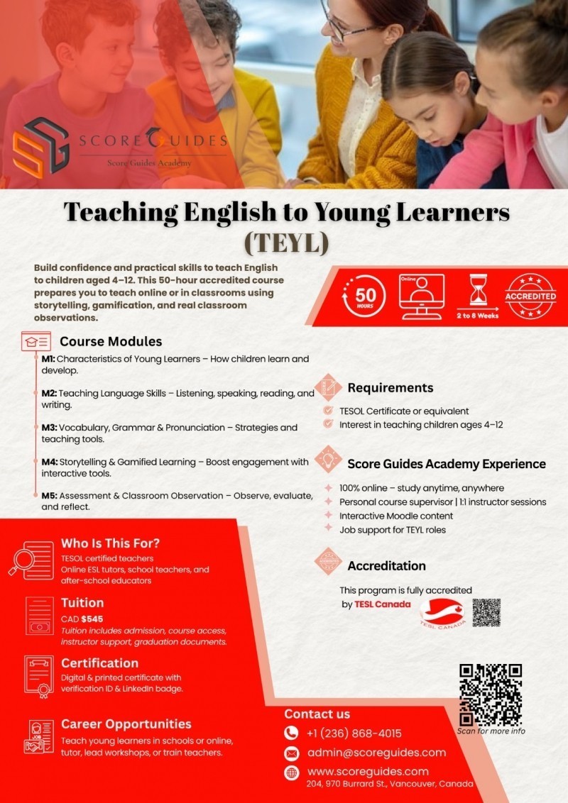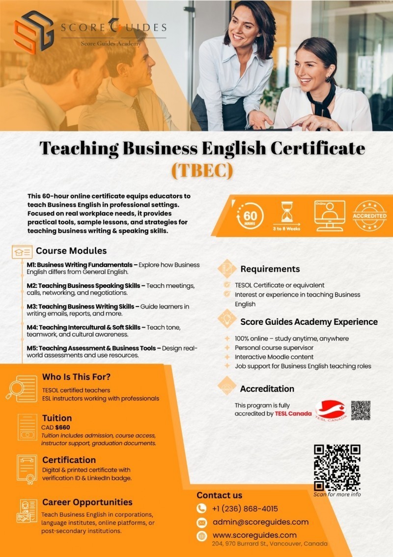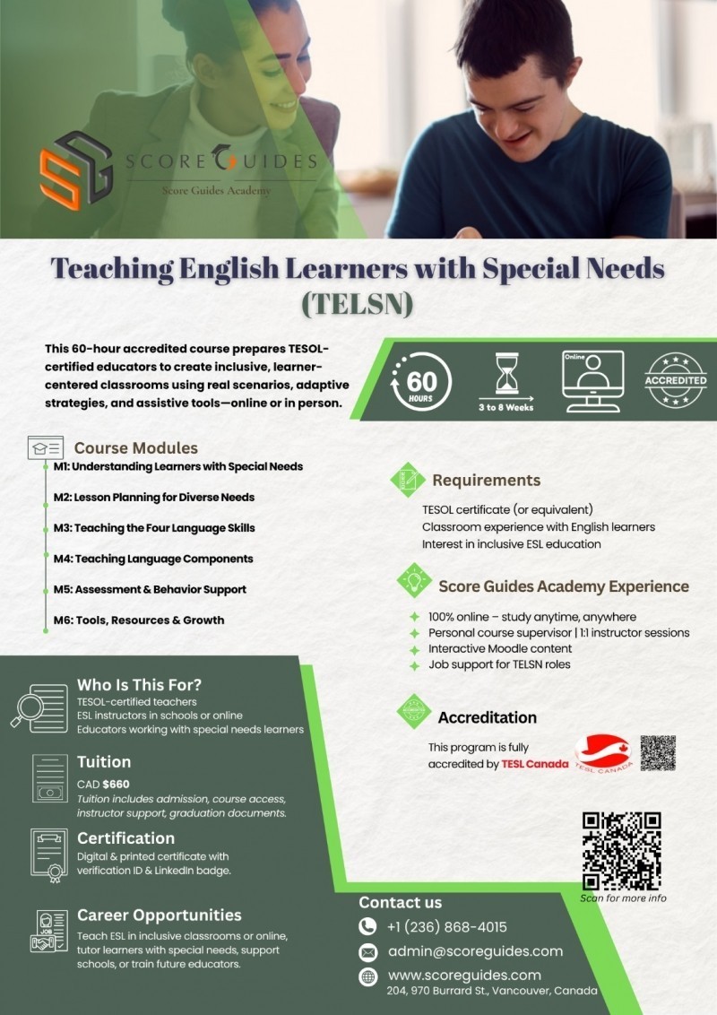 Shënim shtesë: Score Guides është i vetmi institucion kanadez që ofron programe të specializuara TESOL të akredituara nga TESL Canada (50–60 orë) plotësisht online. Këto programe të specializuara janë të shkëlqyera për mësuesit që duan të përqendrohen në fusha si mësimdhënia e nxënësve të vegjël ose mësimdhënia e nxënësve me nevoja të veçanta. Score Guides Academy ofron edhe bursa deri në 150 dollarë për person dhe bursa deri në 250 dollarë për grupe nga 4 deri 6 aplikantë.