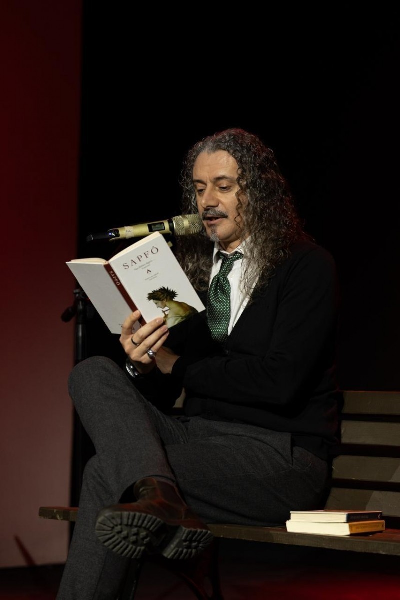 Ai falënderoi Rita Petron për ftesën dhe theksoi veçantinë e kësaj nate, ku për herë të parë lexonte jo poezitë e tij, por ato të autorëve që kishte përkthyer në një aktivitet të organizuar ndonjëherë nga një Poete Laureate. Më pas solli vargje nga botimi kushtuar Sapho-s, duke rikthyer në shqip jehonën e një lirike të lashtë, por përjetësisht moderne.